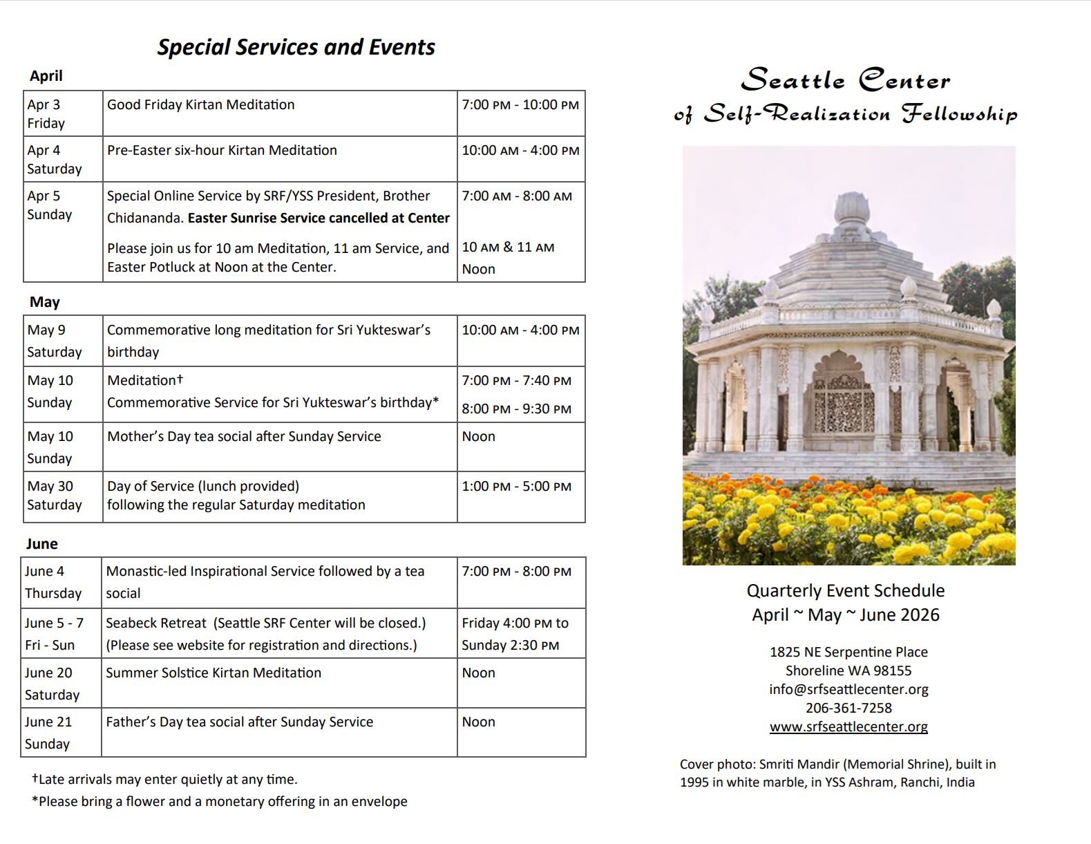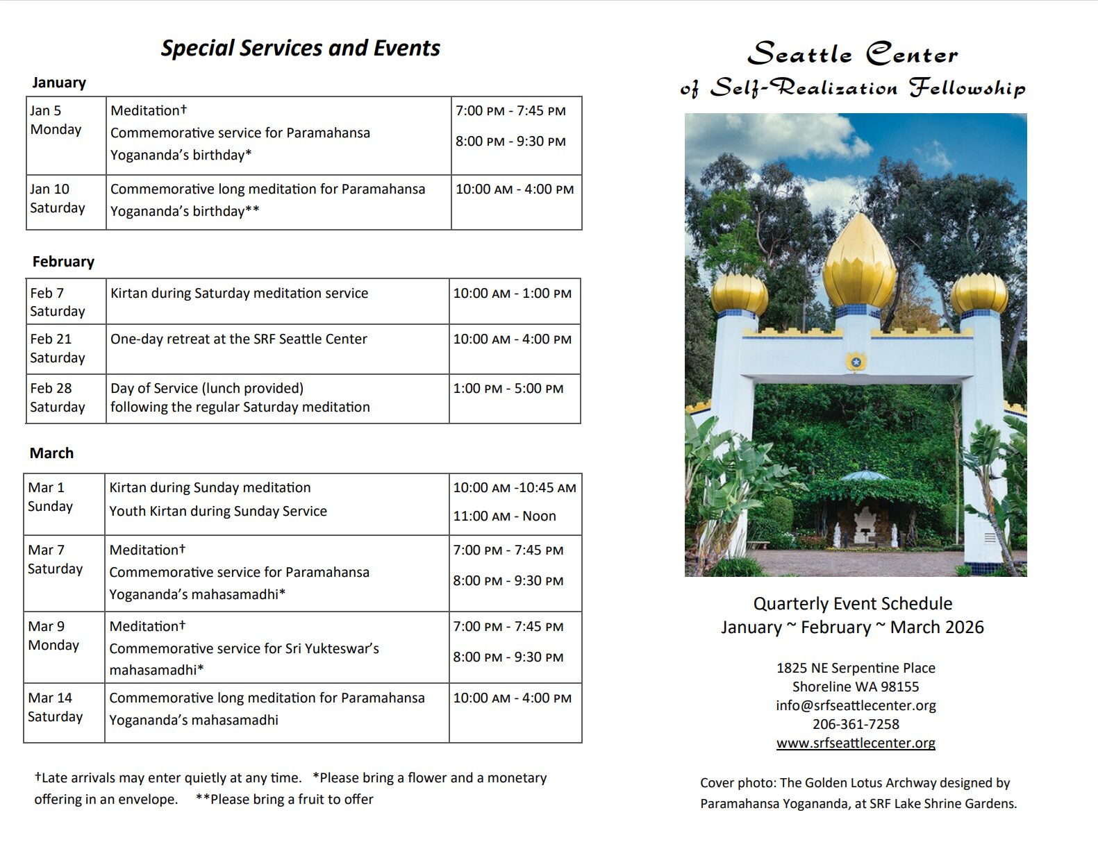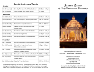 Welcome to the Seattle Center of Self-Realization Fellowship which serves families and friends in the greater Seattle area through weekly devotional and meditation services. The Seattle Center is a branch of Self-Realization Fellowship, a worldwide, non-profit religious organization founded by Paramahansa Yogananda in 1920 to teach scientific techniques of meditation that lead to a direct, personal experience of God. The Center is open to the public for services and special activities. You are invited to attend our services and welcome to stop by our information table to find out more about our activities.